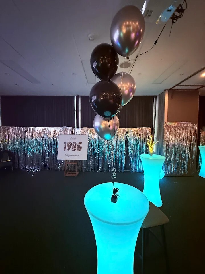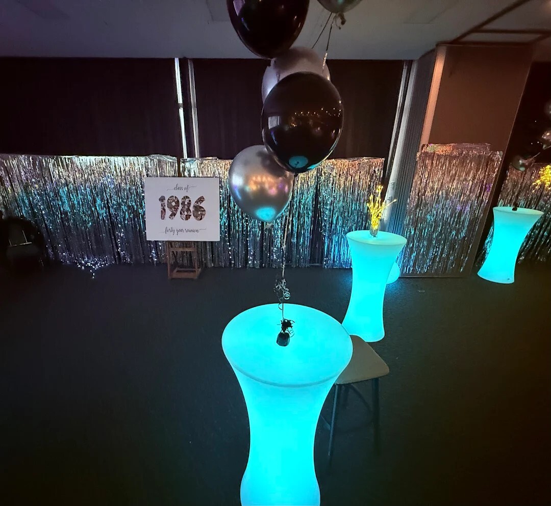 An awesome setup by the lovely Kimberley for her high school Forest High's 40th school reunion. Lots of attention to detail in every way for the table settings, photo booth props, use of glow parties glow furniture, balloons, artwork held at the Master Builders Association club in Dee Why.